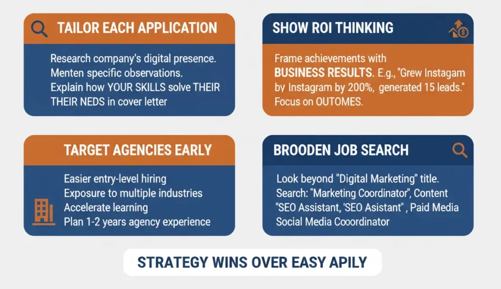 Look beyond “digital marketing” job titles. Search for roles like Marketing Coordinator, Content Specialist, SEO Assistant, Paid Media Specialist, or Social Media Coordinator. These positions often require similar skills but attract fewer applicants.